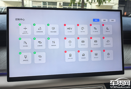 屏幕顶部下拉打开控制中心,包括常用的驾驶模式、屏幕亮度以及声音调节,均能够在左侧进行快速调节。右半部分为圆角矩形的功能卡片,长按即可删减或添加内容。实测来看,选项十分丰富,几乎涵盖了绝大部分的常用功能。