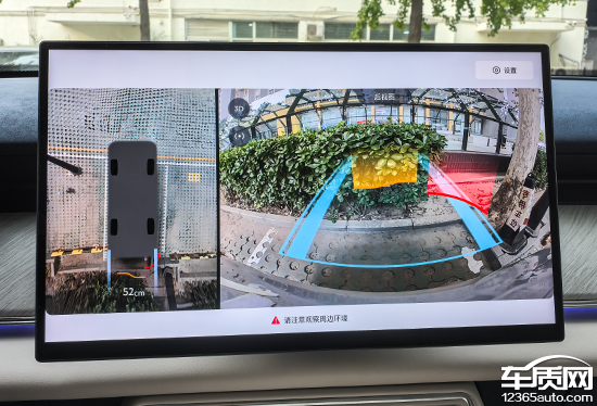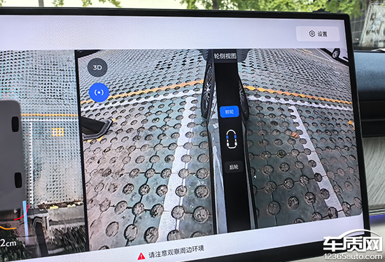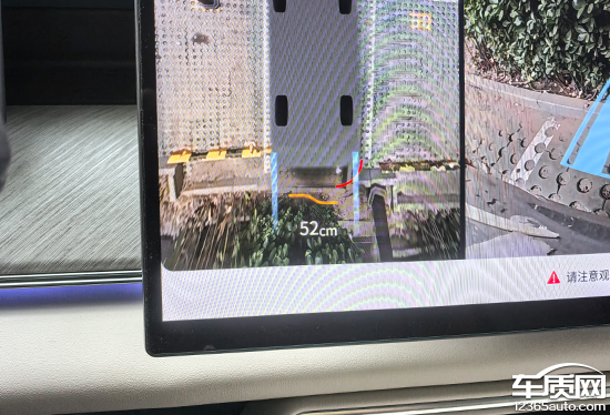 评测车配备透明底盘/540度影像,支持多角度显示。实测来看,在白天阳光比较充足的条件下,画质清晰度表现不错,颗粒感比较轻微。画面边缘存在畸变情况,好在程度并不严重。影像画面内不仅带有可随动的倒车辅助线,并且还能实时显示与障碍物之间的距离,可以为驾驶员提供参考,实用性较强。