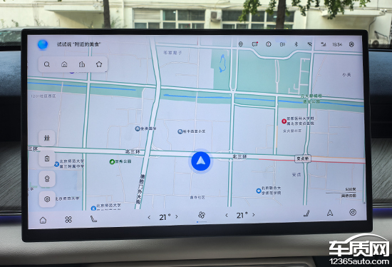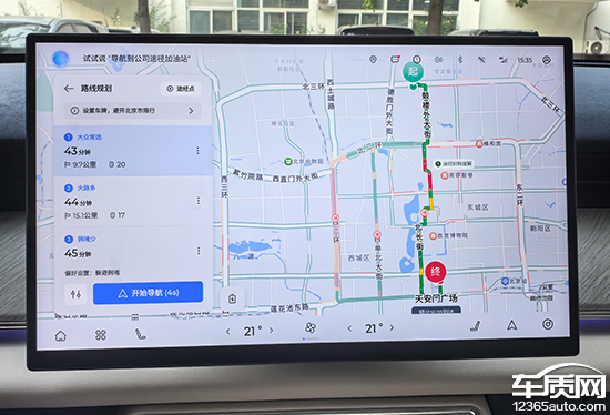评测车内置高德LION版,根据名称不难看出,这是系统定制版的高德地图。实测来看,其主观的使用感受与普通版本的高德地图相差不大,界面布局依然还是熟悉的样子,搜索栏位于左上角,支持多种输入方式。确定目的地后,导航会提供三个选择,基于车联网,还可以实时显示路线的拥堵情况,非常直观。