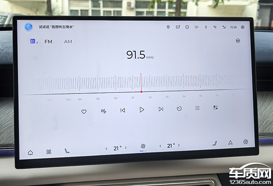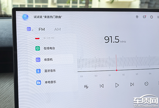 多媒体部分,系统提供原生的FM/AM广播,可以通过语音系统打开或关闭。收音机界面布局简单合理,想要收藏电台,点击“桃心”即可将其存入收藏夹。此外,通过左上角的功能栏还能快速选择音源,包括在线电台、蓝牙音乐以及本地音乐等,交互逻辑简单清晰。