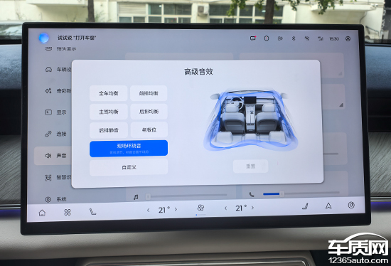 评测车搭载SONY索尼音响系统,带有8个喇叭。实测来看,其音质表现尚可,比较适合播放流行音乐。此外,系统内还提供了丰富的音效设置,包括均衡器、现场环绕音以及自定义等,可玩性较强。