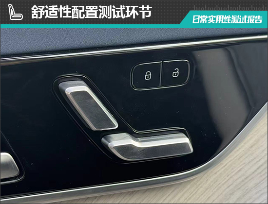 评测车的主/副驾驶座椅均支持电动调节,前排座椅支持加热、通风及按摩功能,整体表现可圈可点。此外,主驾驶座椅还配备了3组座椅记忆,便利性不错。座椅各功能按键布局合理,日常操作起来比较顺手。