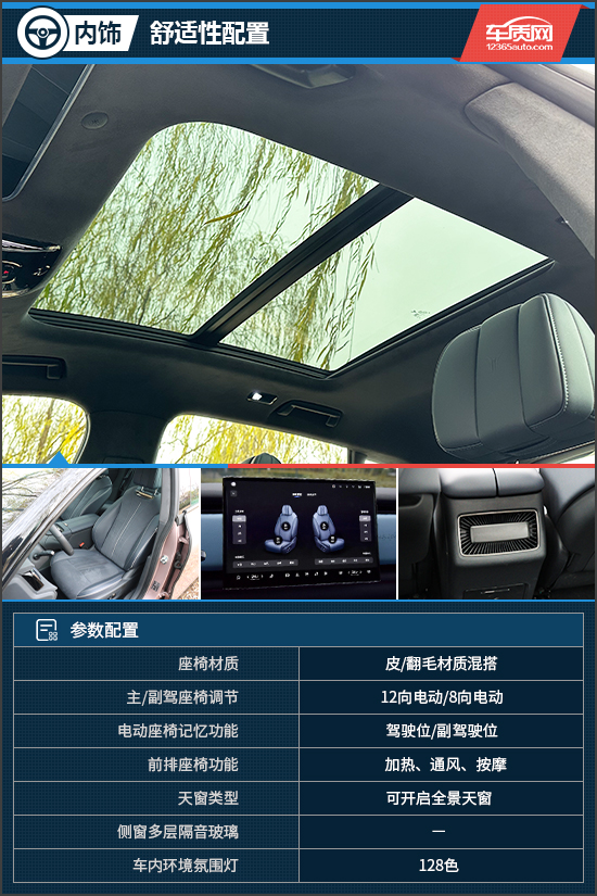 舒适性配置方面,评测车配备可开启全景天窗,面积宽大,有着出色的透光性。座椅配备了皮/翻毛材质混搭,支持多向电动调节且填充物较为柔软,再加上前排座椅加热、通风以及按摩功能,乘坐舒适性表现值得肯定。