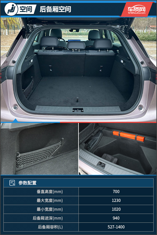 后备厢的内部空间十分规整,常规状态下容积为527L,可以放置不少物品,并且后排座椅支持比例放倒,放倒后可以进一步拓展储物空间。此外,后备厢垫下方还配有一个储物格,内部容积较大,实用性表现出色。
