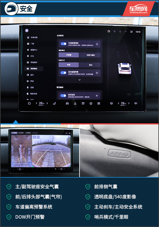 安全配置方面,评测车搭载了丰富的主/被动安全配置。像是主/副驾驶座安全气囊、前/后排头部气囊(气帘)、车道偏离预警系统、DOW开门预警、哨兵模式/千里眼等主/被动安全配置在评测车上均有配备,可以有效提升行车稳定性,在同级中占有一定的优势。