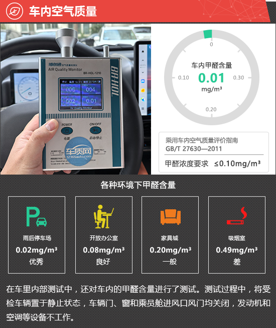在车内空气质量测试环节,将车辆放置在车辆较少的内部地面停车场中,实测车内甲醛含量为0.01mg/m3,符合2012年3月1日起实施的,由原环保部和国家质量监督检验检疫总局联合发布的《乘用车内空气质量评价指南》(中华人民共和国国家标准GB/T 27630-2011)中的相关标准。