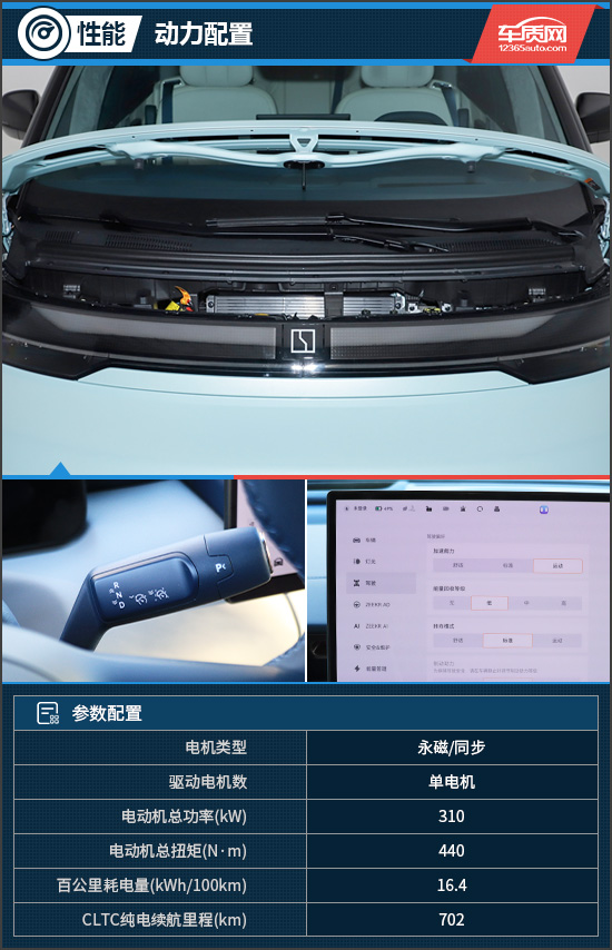 评测车采用的是单电机后驱,电机总功率310kW,总扭矩440N·m,百公里加速时间为6.8s。续航方面,CLTC纯电续航里程为702km。