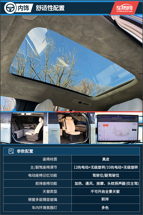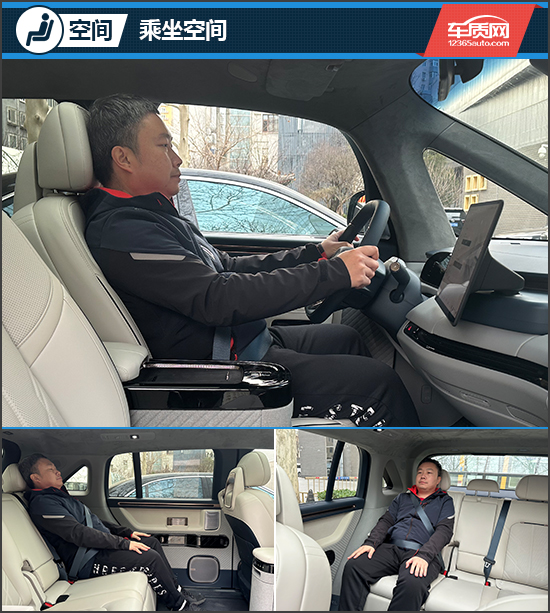 乘坐空间方面,得益于3008mm的长轴距,实测身高175cm的体验者无论在前排还是第二排,都有着充裕的乘坐空间。尤其是第二排,腿部有超过半臂的距离。此外,评测车的后排座椅还配备了加热、通风、按摩以及电动腿托功能,再加上后排座椅电动调节,乘坐舒适性不输豪华MPV。