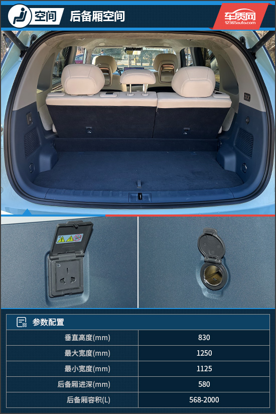 极氪MIX的后备厢较为规整,在常规状态下,内部容积达到568L,可以放置不少物品。当第二排座椅放倒后,此时后备厢容积提升至2000L。此外,评测车的后备厢还配备了220V电源以及12V电源接口,可满足多种用电需求。