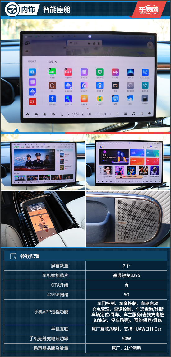 中控屏的尺寸为15.05英寸,分辨率达到2.5K,显示效果出色。车机内置了高通骁龙8295芯片,系统算力和反应速度也十分出众。此外,车机还具有四区域语音唤醒识别、可见即可说、手势控制以及声纹识别功能,智能交互表现达到同级领先水平。