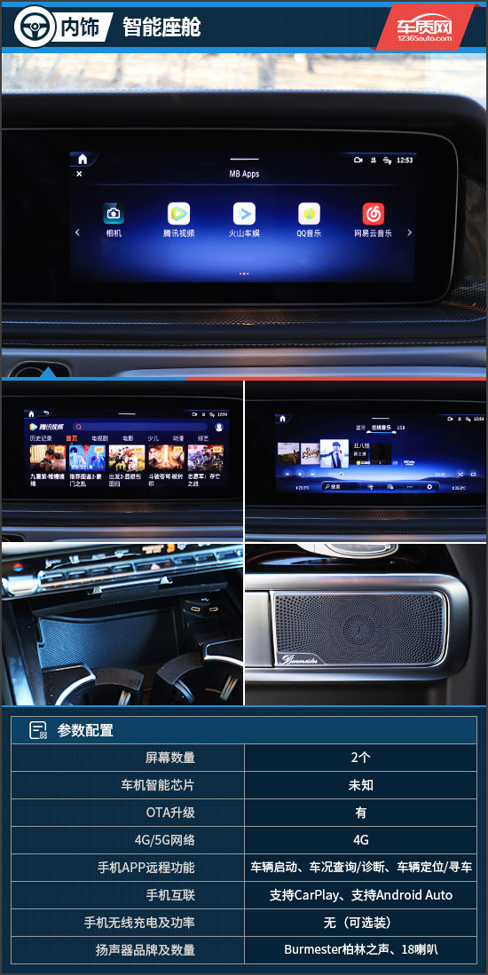 评测车配备由全液晶仪表盘+中控屏组成的双联屏,显示分辨率不错,并且中控屏内置最新一代的MBUX智能人机交互系统,像是语音免唤醒词、双区域语音唤醒识别、语音连续识别等均有配备。此外,中控屏还可显示坡度地平线、指南针、海拔、胎温、差速锁等越野相关信息,让驾驶者能够时刻掌握道路信息以及车辆状态。评测车依然配备Burmester柏林之声音响,喇叭由老款的15个提升至18个,拥有更为出色的音质表现。