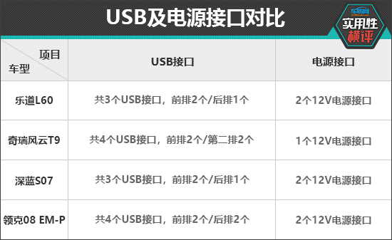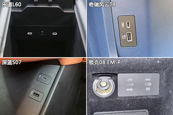 充电接口数量方面,奇瑞风云T9前排和第二排分别配备1个USB Type-A接口和1个USB Type-C接口,能够满足不同移动设备的充电需求。领克08 EM-P全车同样配备4个USB充电接口,前后分布均匀,不过只有后排提供了Type-A和Type-C两种类型。相比之下,乐道L60和深蓝S07全车均提供了3个USB充电接口,前者均为Type-C接口,种类相对单一,后者为Type-A和Type-C两种类型,适配性更好。此外,四款车均配有12V电源接口,实用性表现令人满意。