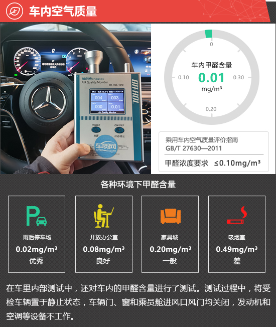 在车内空气质量测试环节,将车辆放置在车辆较少的内部地面停车场中,实测2025款奔驰G500的车内甲醛含量为0.01mg/m3,符合2012年3月1日起实施的,由原环保部和国家质量监督检验检疫总局联合发布的《乘用车内空气质量评价指南》(中华人民共和国国家标准GB/T 27630-2011)中的相关标准。