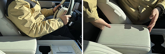 前排中央扶手尺寸适中,表面采用皮质材质包裹,倚靠舒适性不错。中央扶手虽然不支持前后移动和角度调节,但驾驶者在驾驶过程中依然可以将肘部倚靠在上面。
