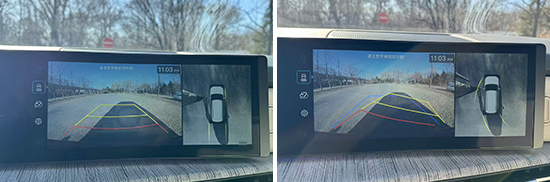 评测车配备了360度全景影像,整体画质清晰度不错。同时,影像画面显示清晰,镜头畸变情况较小,并且还提供了可随动的辅助线,表现出色。