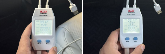 此外,我们对USB接口的电压与电流进行了测试,其中前排USB Type-C接口的电压和电流分别达到8.98V、1.28A和9.03V、1.51A左右。第二排USB Type-C接口的电压和电流分别为9.12V、1.54A和9.11V、1.29A左右。第三排USB Type-C接口的电压和电流分别为9.15V、1.4A和9.13V、1.38A左右。
