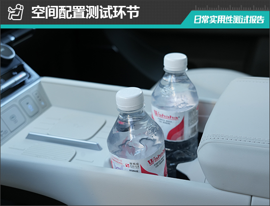 对于车内使用空间的测试,只针对前排触手可及的空间,不包括手套箱、中央扶手箱等需开启的空间。测试方法是将以下固定物品全部放置在前排的各个储物空间内,通过固定物品的放置情况来判断车辆储物空间的表现。测试选定的固定物品为:2瓶常规大小的矿泉水、1部大屏手机、1支口红、1个挎包、1副墨镜、1把折叠雨伞以及1包常规尺寸的抽纸。