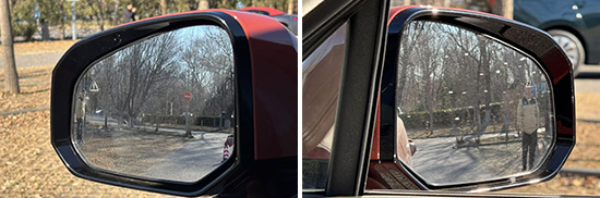 评测车左、右外后视镜均采用普通镜片。经实测,左、右外后视镜视野范围分别为26.5°和21.8°,均处于同级别上游水平,两侧视野盲区较小。