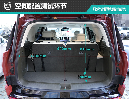 对于评测车后备厢的基础数值,我们也进行了实测,开口长度为900mm;开口宽度为1230mm;后备厢进深为380mm;后备厢地台与顶部的垂直高度为810mm。