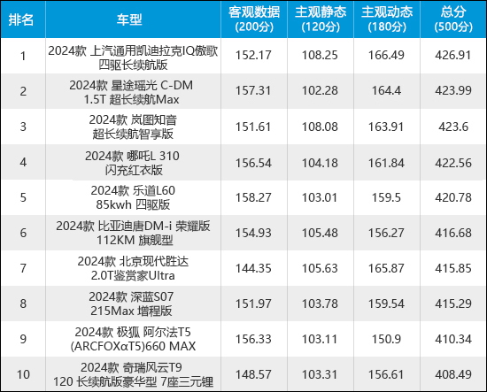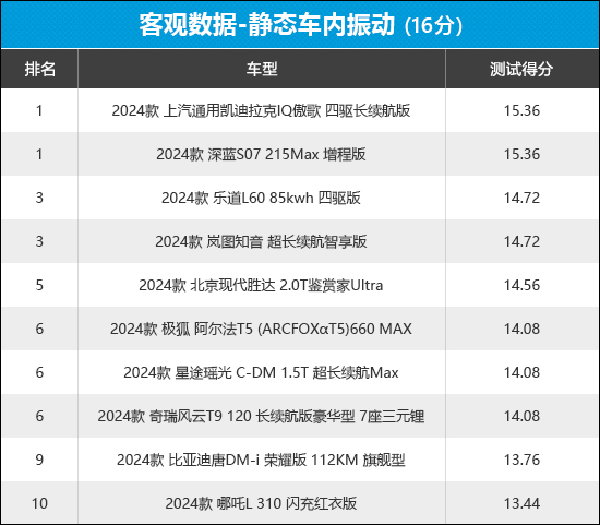 从榜单排名来看,凯迪拉克IQ傲歌和深蓝S07处于领跑地位,可见这2款车型非常注重车内驾乘人员的舒适性体验。哪吒L在10款车型中排名垫底,其在座椅振动方面失分较多。