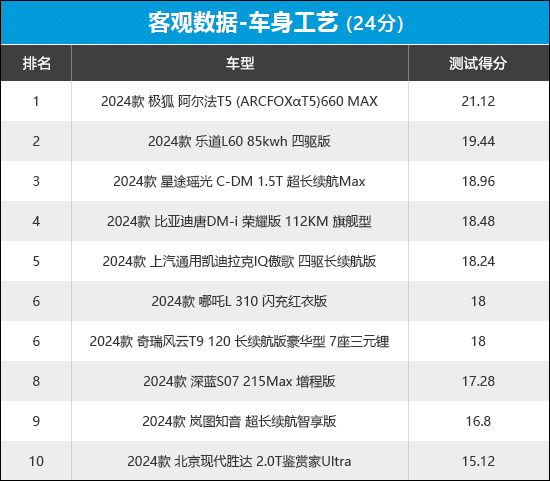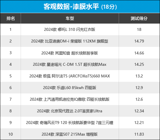 从榜单中可以看出,哪吒L在此环节拿到了满分,整车的漆膜厚度和喷涂均匀性表现可圈可点。深蓝S07在此环节表现不佳,整车漆膜平均厚度在测试过的同级别车型中处于中游水平,排名垫底。