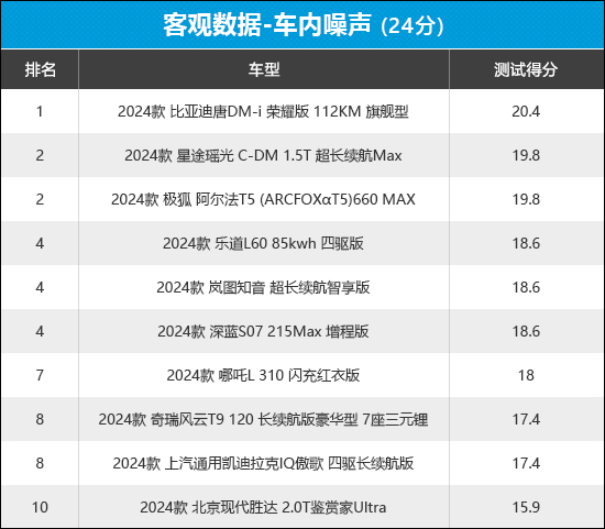 从榜单排名来看,比亚迪唐DM-i凭借在车内噪声和空调噪声测试中的良好表现排名榜首。北京现代胜达在车内噪声测试部分失分较多,导致其排名垫底。