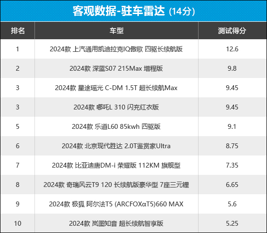 从榜单排名可以看出,各车型之间的得分存在较大差异,凯迪拉克IQ傲歌整体表现最佳,排名榜单首位。岚图知音排名垫底,且得分与排名靠前的车型差距较大,主要原因在于后驻车雷达最近端探测距离与同级别车型测试均值差距偏大。