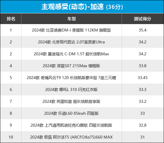从榜单排名来看,比亚迪唐DM-i测试得分最高,在加速踏板脚感、驾驶模式、油耗和加速感受方面得到了满分。相比之下,极狐阿尔法T5与其他9款车型存在一定差距,其在电耗和加速性能方面失分较多。