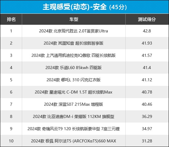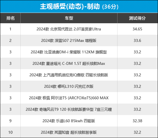 从榜单排名情况来看,北京现代胜达排名榜首,在制动踏板脚感、制动踏板行程、制动类型和制动性能方面得到了满分成绩。岚图知音由于在体验过程中发现制动踏板初段有明显虚位,给整体得分拖了后腿。
