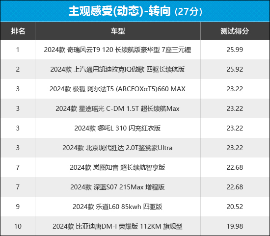 从榜单排名情况来看,奇瑞风云T9各项测试中表现均衡,得分排名榜首;凯迪拉克IQ傲歌表现同样可圈可点,在4项测试中拿到满分。相比之下,比亚迪唐DM-i在该测试环节表现一般,失分集中在转向性能和转向感受方面。