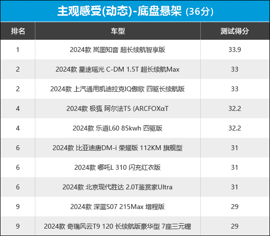 从榜单车型的得分来看,岚图知音拔得头筹,其在底盘感受、行驶稳定性和悬架功能三个项目中获得满分。相比之下,深蓝S07和奇瑞风云T9失分较多,两款车型在行驶稳定性方面表现欠佳。
