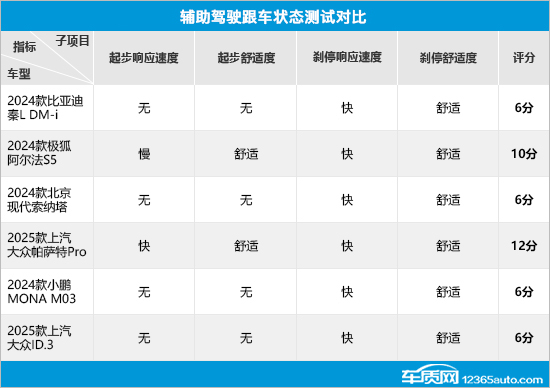 在跟车状态测试中,只有帕萨特Pro一款车型获得了满分。相对而言,2024款极狐阿尔法S5(以下简称阿尔法S5)只是在起步响应速度方面略有丢分,整体表现可圈可点。另外四款车型的问题主要是均不支持自动跟车起步功能,因此在起步响应速度和舒适度两项未获得分数。