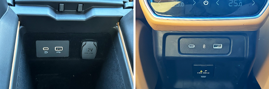 评测车前排配备1个USB Type-C接口和1个USB Type-A接口,均位于中央扶手箱内部;后排空调出风口下方配备1个USB Type-C接口和1个USB Type-A接口;第三排配备1个USB Type-A接口,位于第三排座椅右侧,布局合理且兼容性不错。此外,中央扶手箱内部以及后备厢还分别提供1个12V电源接口,第二排还提供一个220V电源接口,能够满足车内乘客多种电子设备的用电需求。