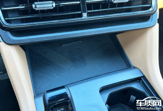 评测车在前排配备了1个手机无线充电板,位于杯架前方,拿放手机十分便捷。并且充电功能可通过中控屏手动关闭,但不具备散热功能,略有遗憾。
