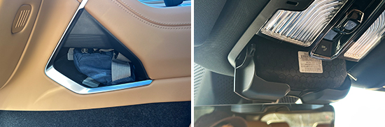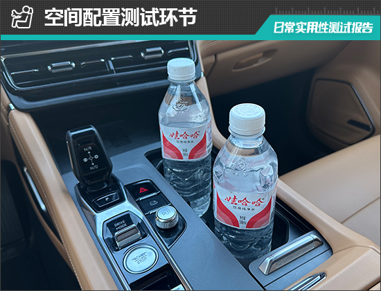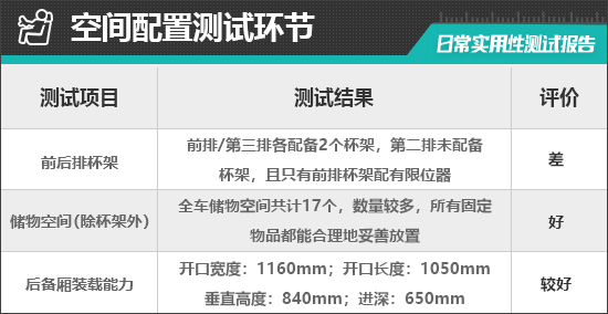 对于车内使用空间的测试,只针对前排触手可及的空间,不包括手套箱、中央扶手箱等需开启的空间。测试方法是将以下固定物品全部放置在前排的各个储物空间内,通过固定物品的放置情况来判断车辆储物空间的表现。测试选定的固定物品为:2瓶常规大小的矿泉水、1部大屏手机、1支口红、1个挎包、1副墨镜、1把折叠雨伞以及1包常规尺寸的抽纸。