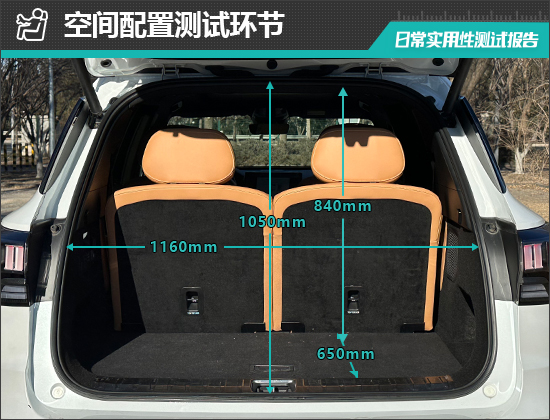 对于后备厢的基础数值,我们也进行了实测,开口长度为1050mm;开口宽度为1160mm;后备厢进深为650mm;后备厢地台与顶部的垂直高度为840mm。