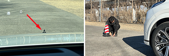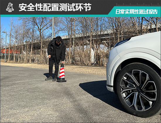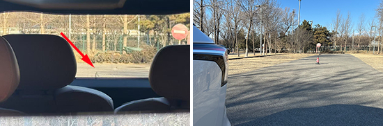 在测试前方视野环节,我们采用高70cm的桩桶作为参照物,随后调整车距,直至在主驾驶位可以看到桩桶上沿。经过测试,桩桶与车头最终测得的数据为2.482m,在测试过的同级别车型中处于上游水平。