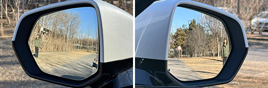 评测车的左/右外后视镜均采用了普通镜片,实测左外后视镜视野范围为23.6°,右外后视镜视野范围为19°,两侧后视镜均处于同级别中游水平。