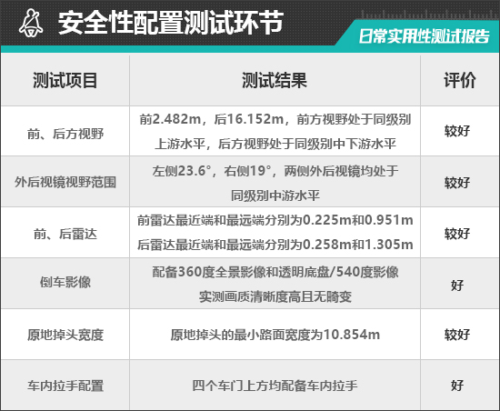 在车辆前、后方视野测试中,车内所有座椅均已调整至最低状态,所测出的数据与驾驶者正常使用时均有一些偏差,仅供参考。