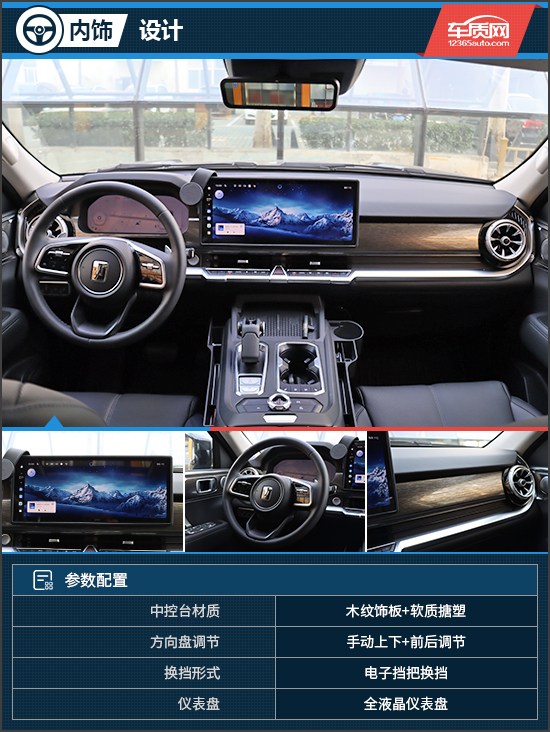 坦克400 Hi4-T车内采用“T”字形布局,整体造型十分规整。同时,车内还保留了大量的实体按键,方便驾驶时的盲操作。在内部材质上,评测车还使用了大量软性材质进行包裹,仪表台处还配有木纹饰板,进一步提升了车内质感。此外,挡把前方布置了两个50W手机无线充电板,右侧配有两个带限位器的杯架,实用性表现较好。