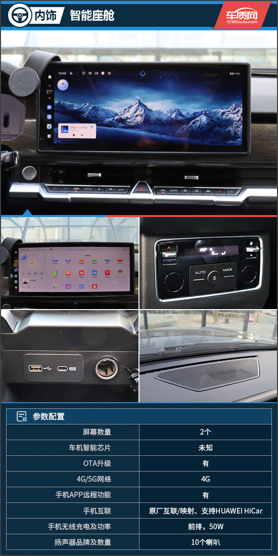 评测车配备了12.3英寸液晶仪表、16.2英寸超大中控屏、HUD抬头显示和流媒体后视镜,进一步提升了车内的科技感。同时,车机还支持语音免唤醒词、四区域语音唤醒识别、语音连续识别等。实际体验中,系统响应速度十分流畅,达到同级领先水平。此外,中控屏还可显示征服者视角、差速锁等越野相关信息,让驾驶者能够时刻掌握道路信息以及车辆状态。评测车还配备了10个扬声器,不仅位置分布均匀,还可轻松驾驭各类音乐,能带来更为震撼的听觉体验。