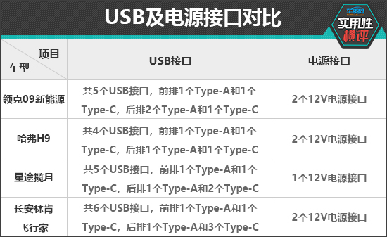 充电接口方面,长安林肯飞行家表现最为出众,全车配备了6个USB接口。除星途揽月外,其余三款车型均配备2个12V电源接口,能够满足日常生活所需。