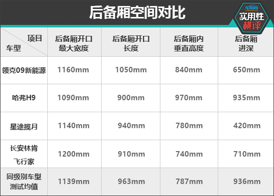 本期参与对比的四款中大型SUV在实用性方面均交出了令人满意的答卷,满足日常基本使用需求完全没有问题,并且还提供了丰富的舒适性和实用性配置。不过,从具体测试环节来看,四款车型也都存在值得优化的地方。比如领克09新能源后方视野盲区相对较大,并且左右外后视镜视野范围角度未达到同级别车型测试均值;哈弗H9没有配备放置墨镜的眼镜盒;星途揽月的12V电源接口较少;长安林肯飞行家后排杯架未配备限位器等。综合来看,四款车型的实用性表现均未有明显硬伤,消费者可以按需进行选择。