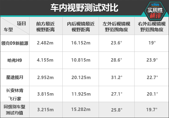 实测过程中,领克09新能源的前方视野测试成绩表现不错,达到了同级别上游水平。相比之下,哈弗H9和长安林肯飞行家的前方视野盲区相对较大,测试成绩均为同级别中下游水平。在后方视野测试中,长安林肯飞行家扳回一城,数据层面与哈弗H9均达到同级别上游水平,而领克09新能源后方视野盲区相对较大,数据层面为同级别中下游水平。