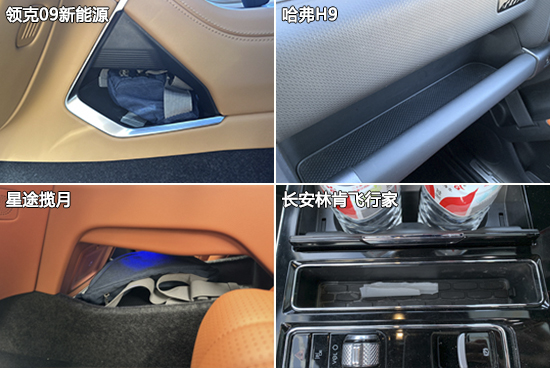 车内储物空间方面,领克09新能源整车储物空间(除杯架外)数量最多,达到了17个,而哈弗H9数量最少,为14个。实测过程中,除哈弗H9外,其余三款车型均有专属的眼镜盒用来放置墨镜,且其他物品也都能合理摆放,实用性表现值得肯定。