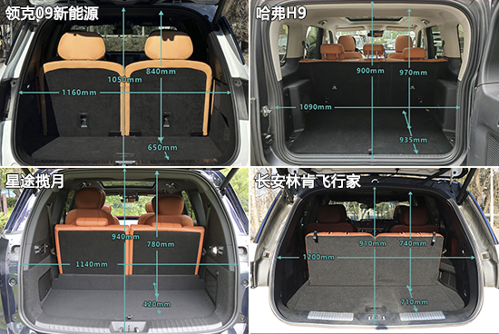 后备厢方面,四款车型的后备厢地台都比较平整,掀开地台后,底部均有私密性的储物空间。对于四款车型的后备厢实际载物能力,我们进行了测量。其中,领克09新能源有三项数据超过同级别车型测试均值,整体表现好于其他三款车型。