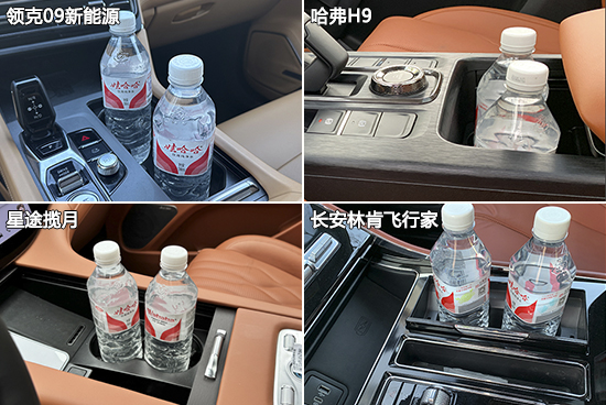 杯架测试中,哈弗H9和星途揽月表现相对出色,其中,哈弗H9全车共配备4个水杯架,并全部提供限位器;星途揽月虽然第三排未配备限位器,但全车提供6个水杯架,数量上占优。领克09新能源和长安林肯飞行家全车均提供4个水杯架,不过后排都没有配备限位器。