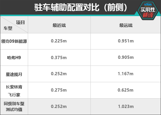 在后驻车雷达测试中,哈弗H9和长安林肯飞行家的最远探测距离均超过了同级别车型测试均值,雷达功率表现相对较好。最近提示距离方面,领克09新能源与同级别车型测试均值最为接近。