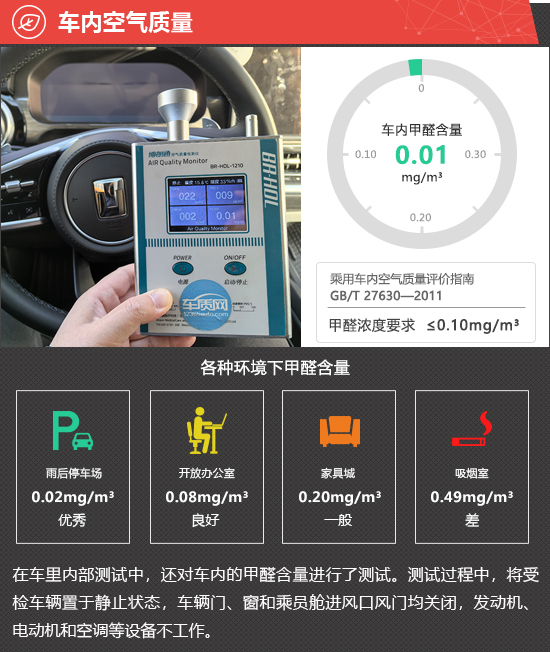 在车内空气质量测试环节,将车辆放置在车辆较少的内部地面停车场中,实测2024款坦克400 Hi4-T的车内甲醛含量为0.01mg/m3,符合2012年3月1日起实施的,由原环保部和国家质量监督检验检疫总局联合发布的《乘用车内空气质量评价指南》(中华人民共和国国家标准GB/T 27630-2011)中的相关标准。