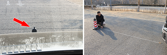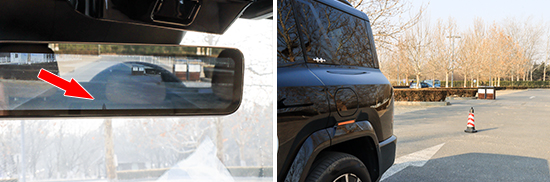 后方视野测试中,依旧将桩桶固定摆放,随后移动车辆直至可以观察到桩桶上沿为止。得益于流媒体后视镜的加持,经实测,后方视野所测得的距离为5.324m,在测试过的同级别车型中处于上游水平。
